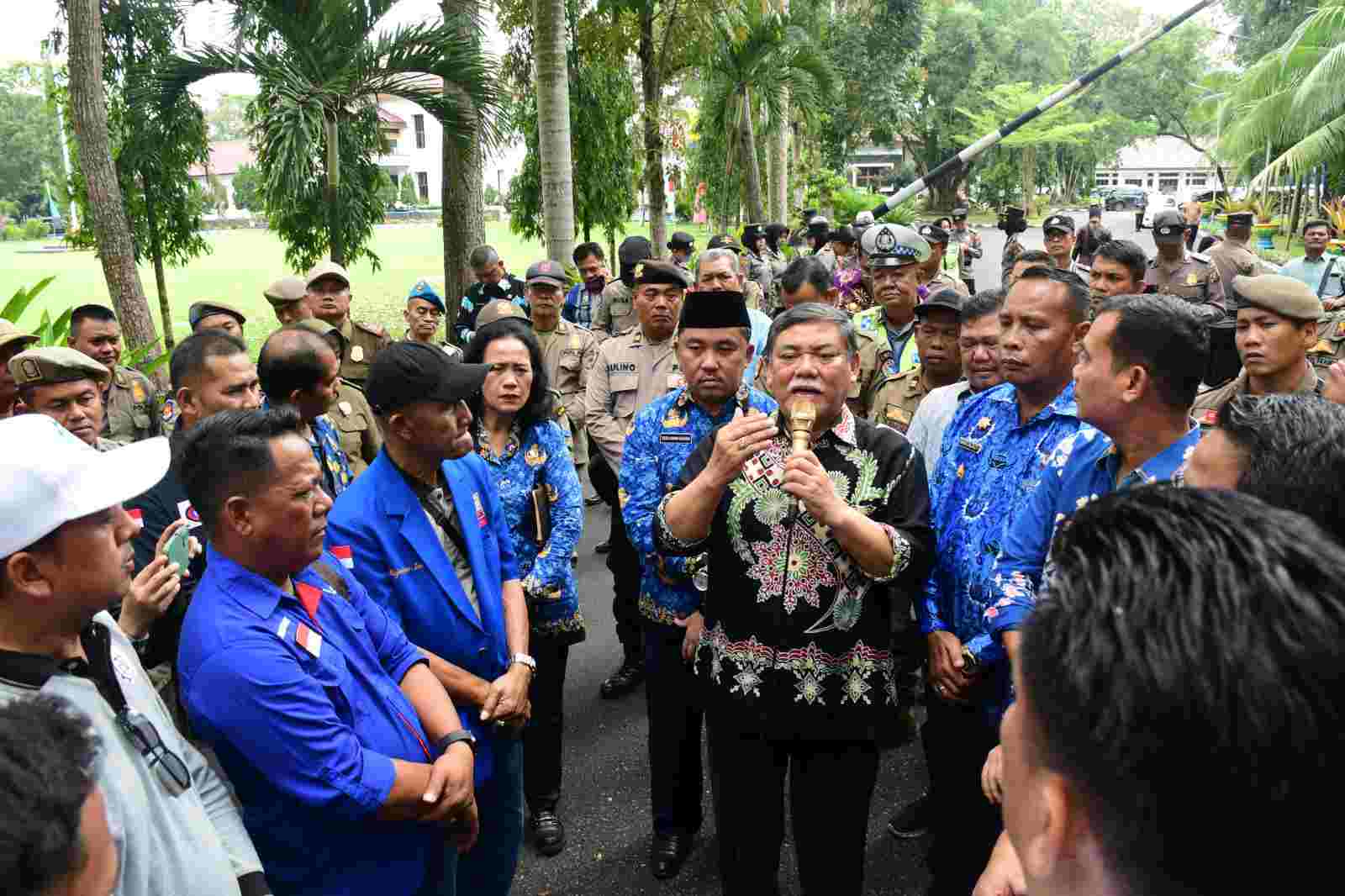 Lensa Mata Deli Serdang – Pelaksana Tugas Bupati Deli Serdang, HM Ali Yusuf Siregar menyahuti tuntutan ratusan pengunjukrasa dari aliansi buruh yang tergabung dalam Gerakan Buruh Berjuang untuk Keadilan (GEBBRAK) di depan Kantor Bupati Deli Serdang, Kamis (23/11/2023).