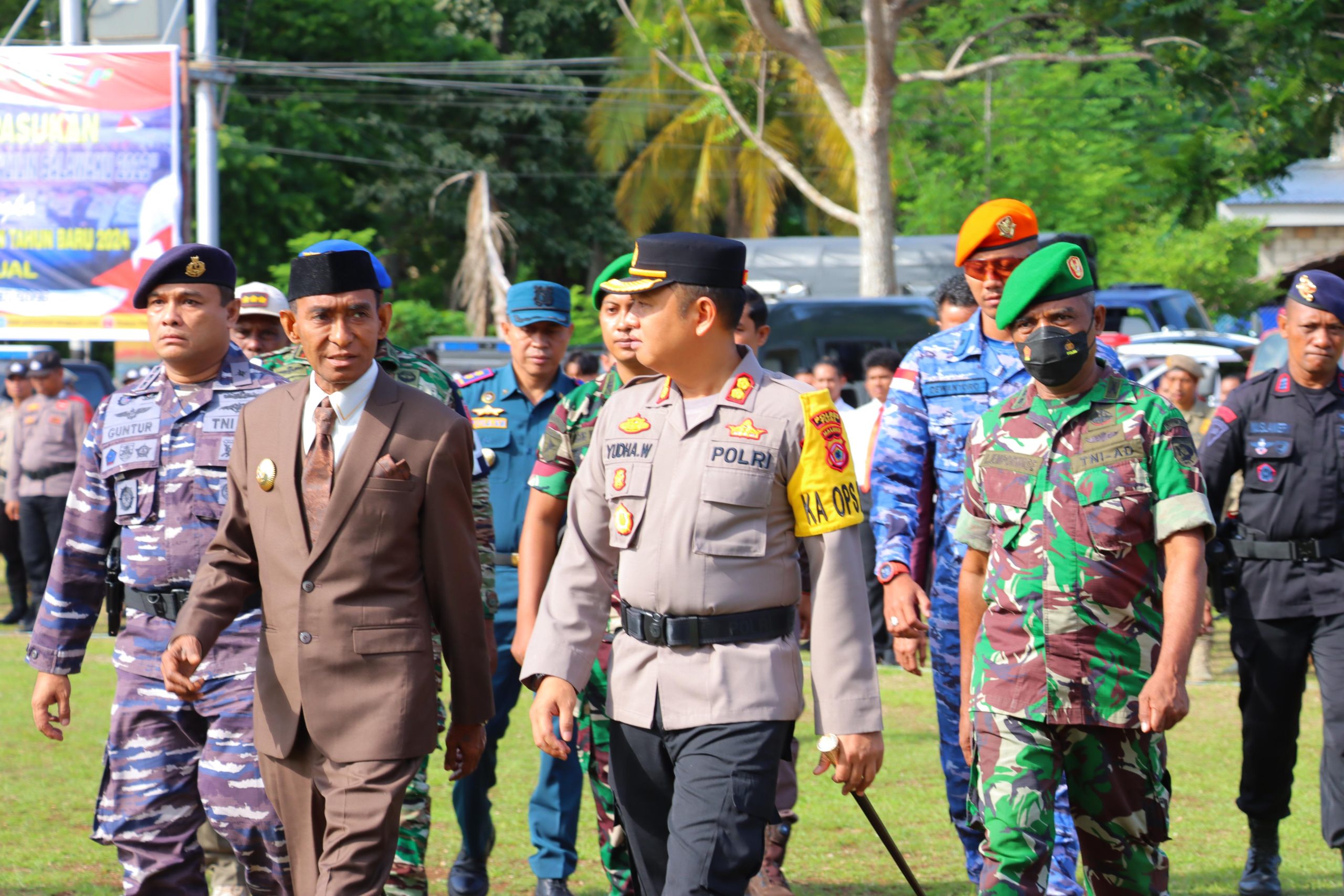 Pj. Walikota Tual Hi. Akhmad Yani Renuat, S.Sos, M.Si, M.H saat membacakan amanat Kapolri Jenderal Listiyo Sigit Prabowo mengatakan Apel Gelar Pasukan merupakan bentuk pengecekan akhir kesiapan personel maupun sarpras yang akan digunakan selama pelaksanaan operasi, sehingga diharapkan seluruh kegiatan pengamanan perayaan natal 2023 serta tahun baru 2024 (nataru) dapat berjalan dengan optimal.