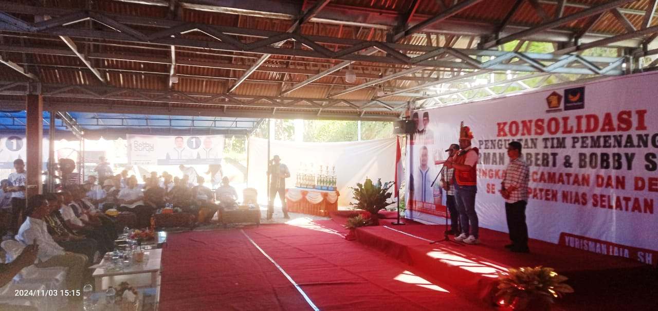 Lensa Mata Nias Selatan – Kunjungan paslon Gubernur Sumut “Bobby-Surya” urut satu (1) bersama rombongan di Kantor DPC Partai Gerindra Kabupaten Nias Selatan disambut baik oleh Ketua DPC Partai Gerindra, Thomas Dachi, S.H., M.H., M.I.P bersama dengan paslon Bupati Nias Selatan “Firman-Robert” beserta anggota DPRD Nias Selatan dari Partai Gerindra dan Partai Nasdem (partai pengusung) serta Tim Pemenangan Firman-Robert se-Kabupaten Nias Selatan, Relawan dan Simpatisan, Minggu (03/11/2024) kemarin.