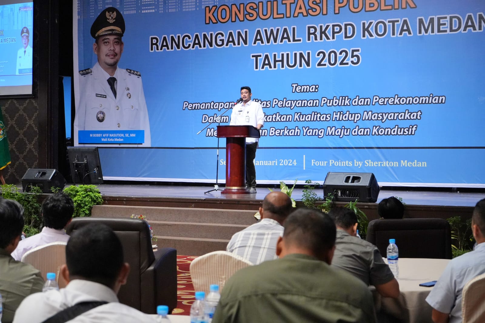Lensa Mata Medan – Wali Kota Medan, Bobby Nasution membuka konsultasi publik rancangan awal Rencana Kerja Pemerintah Daerah (RKPD) Kota Medan tahun 2025 di Hotel Four Point Medan, Selasa (16/1).