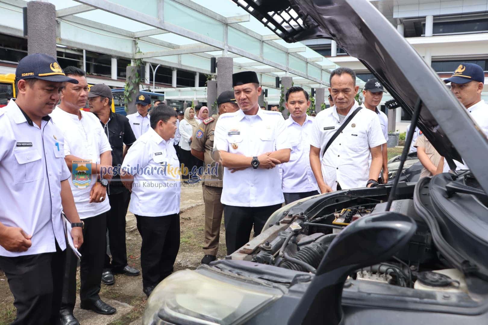 Lensa Mata Pesisir Barat – Kepala Dinas Komunikasi, Informatika, Statistik, dan Persandian (Diskominfotiksan) Suryadi, S.IP., M.M., menginformasikan bahwa, Bupati Pesisir Barat (Pesibar), Dedi Irawan, didampingi Wakil Bupati, Irawan Topani, S.H., M.Kn., memeriksa seluruh Kendaraan Dinas (Randis) yang ada di Organisasi Perangkat Daerah (OPD), Unit Pelaksana Teknis Dinas (UPTD) Puskesmas, dan Kecamatan, di Halaman Kompleks Perkantoran Pemkab Pesibar, Rabu (5/3/2025).