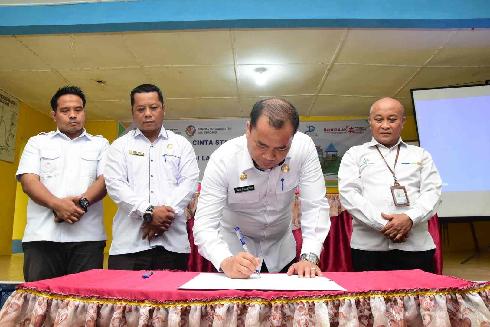 Penandatanganan dilakukan, pada Pencanangan Desa Cantik Kabupaten Deli Serdang Tahun 2023 di Aula Desa Denai Lama, Kecamatan Pantai Labu, Rabu (22/11/2023).
