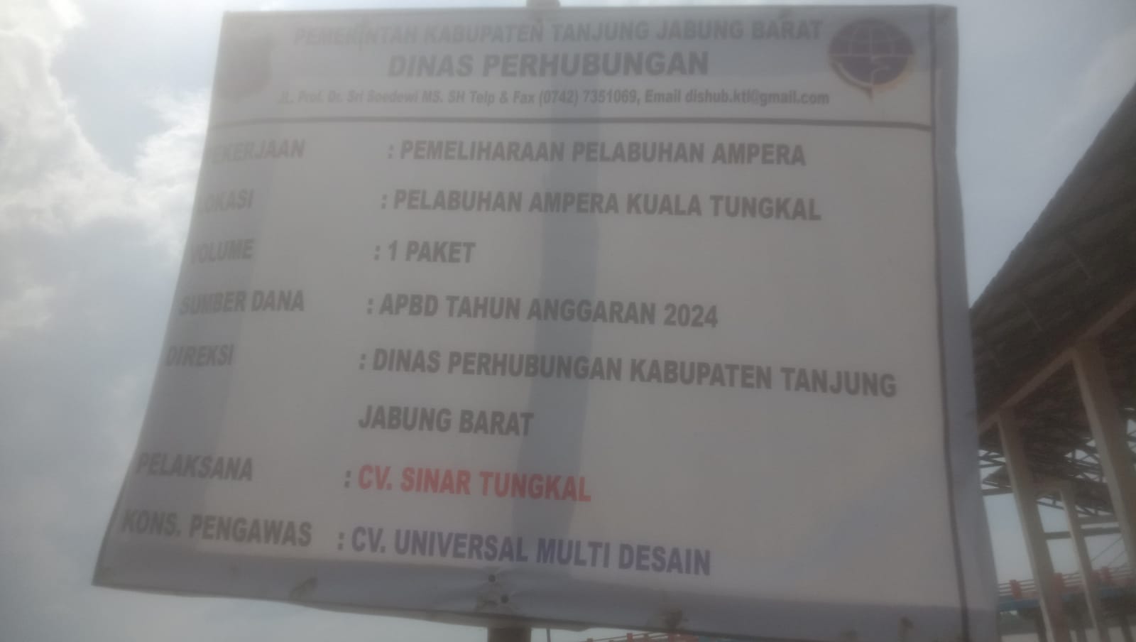 Lensa Mata Tanjab Barat – Proyek pemeliharan pelabuhan Ampera kuala tungkal Dinas Perhubungan (Dishub) Tanjab Barat yang dikerjakan oleh CV Sinar Tungkal kembali disorot aktivis muda.