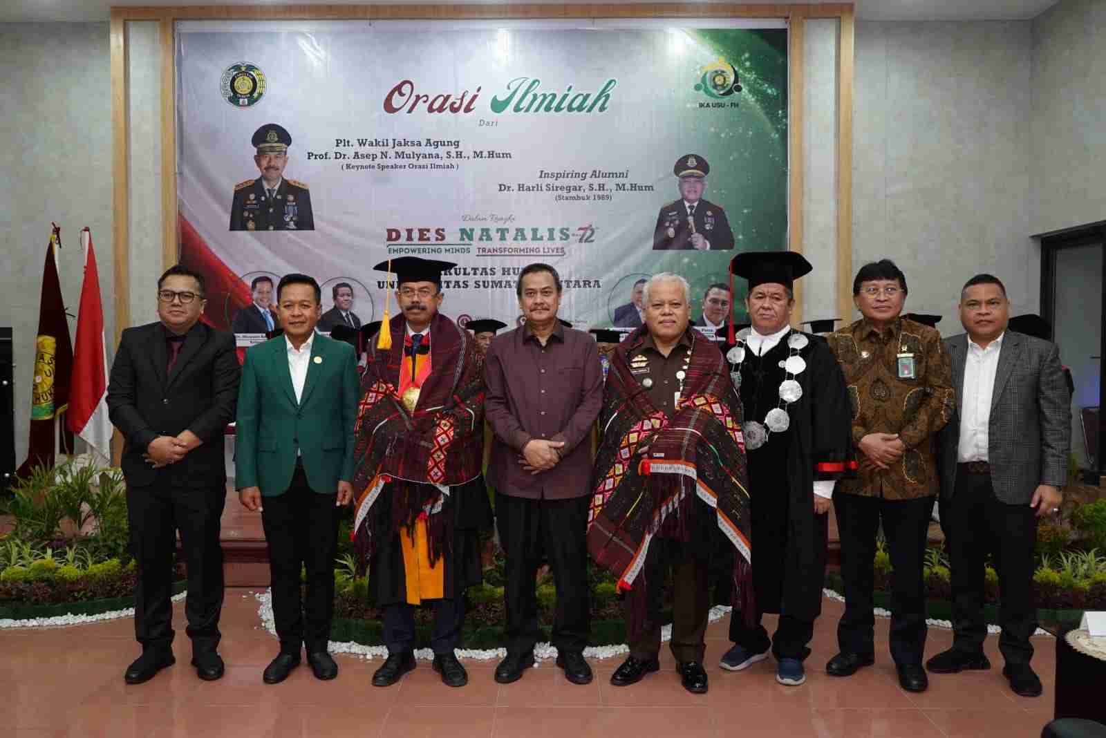 “Saya sampaikan selamat Dies Natalis ke-72 kepada fakultas hukum Universitas Sumatera Utara, secara khusus saya sampaikan ucapan terimakasih kepada Prof Dr. Asep N Mulyana selaku Plt.Wakil Jaksa Agung yang turut hadir langsung dan memberikan orasi ilmiah, kemudian kepada Dr. Harli Siregar, SH., M.Hum selaku alumni Fakultas Hukum USU sebagai salah satu alumni fakultas hukum USU yang dipandang sangat menginspirasi secara positif bagi generasi penerus di lingkungan fakultas hukum,” ujarnya.