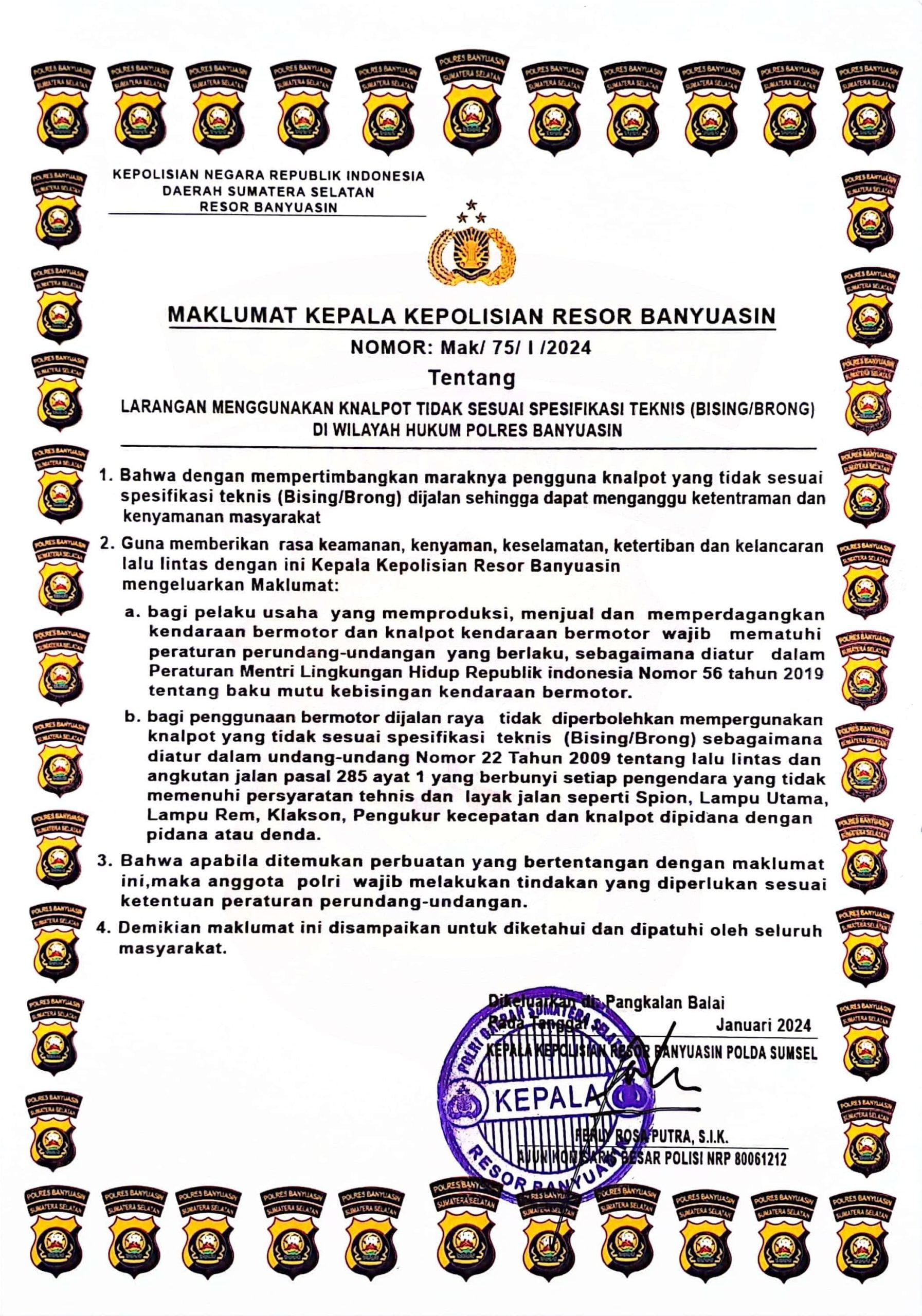 Adapun maklumat Kapolres Banyuasin Nomor : Mak/75/1/2024 tentang larangan penggunaan knalpot tidak sesuai spesifikasi teknis (Bising/Brong) di wilayah hukum Polres Banyuasin.