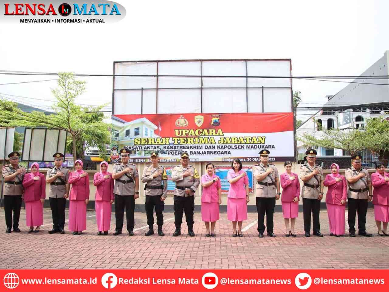 Lensa Mata Banjarnegara || Jabatan Kasat Reskrim dan Kasat Lantas dan Kapolsek Madukara jajaran Polres Banjarnegara diganti, serah terima jabatan dipimpin oleh Kapolres Banjarnegara AKBP Era Johny Kurniawan, SIK, MH di halaman Mapolres Banjarnegara, Jumat (20/10/2023).