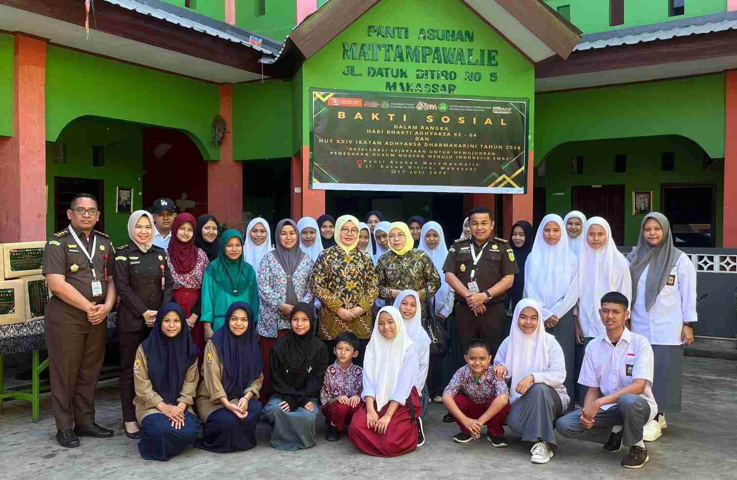 Bakti sosial tersebut dilaksanakan secara bersamaan di 2 (dua) panti asuhan, yakni Panti Asuhan Mattampawalie yang terletak di jalan Datuk Ditiro No. 5 Makassar dipimpin oleh Ketua Ikatan Adhyaksa Dharmakarini (IAD) Wilayah Sulsel, Ny. Fauziah Agus beserta jajarannya, dan didampingi oleh Ketua Panitia HBA, Feri Tas yang juga merupakan Asdatun Kejati Sulsel.