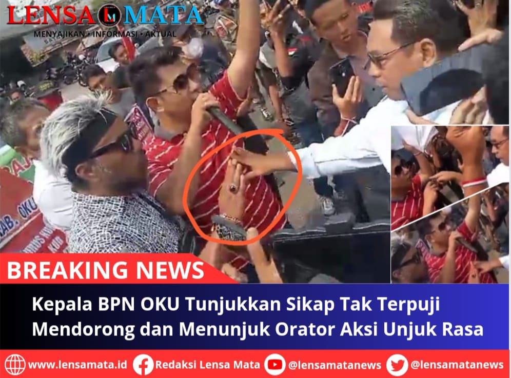 Sambil menunjuk dan mendorong orator, Kepala BPN OKU mengatakan “tanah itu beli sama nenek kamu (dengan gaya arogannya). Kepala BPN juga mengatakan “jika mau melapor silahkan laporkan kemana saja”.