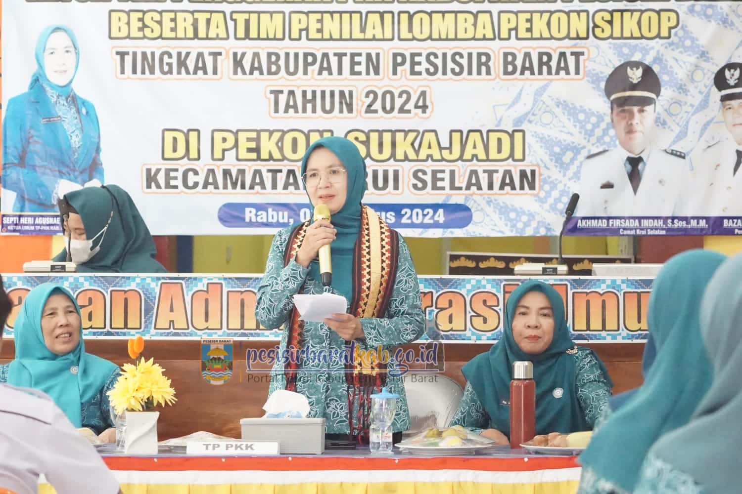 Lensa Mata Pesisir Barat – Kepala Dinas Komunikasi, Informatika, Statistik, dan Persandian (Diskominfotiksan), Suryadi, S.IP., M.M., menginformasikan bahwa, Ketua Tim Penggerak-Pemberdayaan Kesejahteraan Keluarga (TP-PKK) Kabupaten Pesisir Barat (Pesibar), Septi Heri Agusnaeni, S.E., M.H., membuka Lomba Pekon Sehat, Indah, Kecah, Oke Admnistrasinya, Peduli Lingkungan (SIKOP) yang berlangsung di Balai Pekon Suka Jadi Kecamatan Krui Selatan, Rabu (7/8/2024).