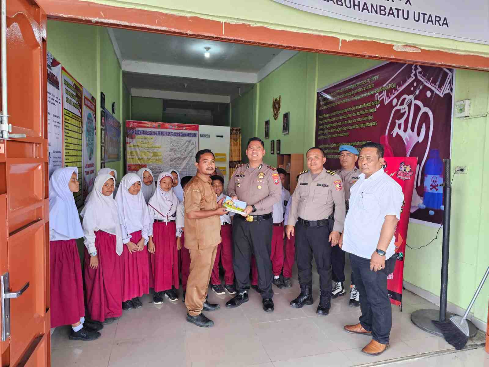 Kapolres Labuhanbatu AKBP James H. Hutajulu melalui Kapolsek Na IX-X AKP Panji Nugraha, S.I.K.,M.H. beserta personil dan Siswa Setukpa melaksanakan pembagian buku bacaan di Posko KBN Desa Kampung Pajak Kecamatan Na IX-X, Kabupaten Labuhanbatu Utara.