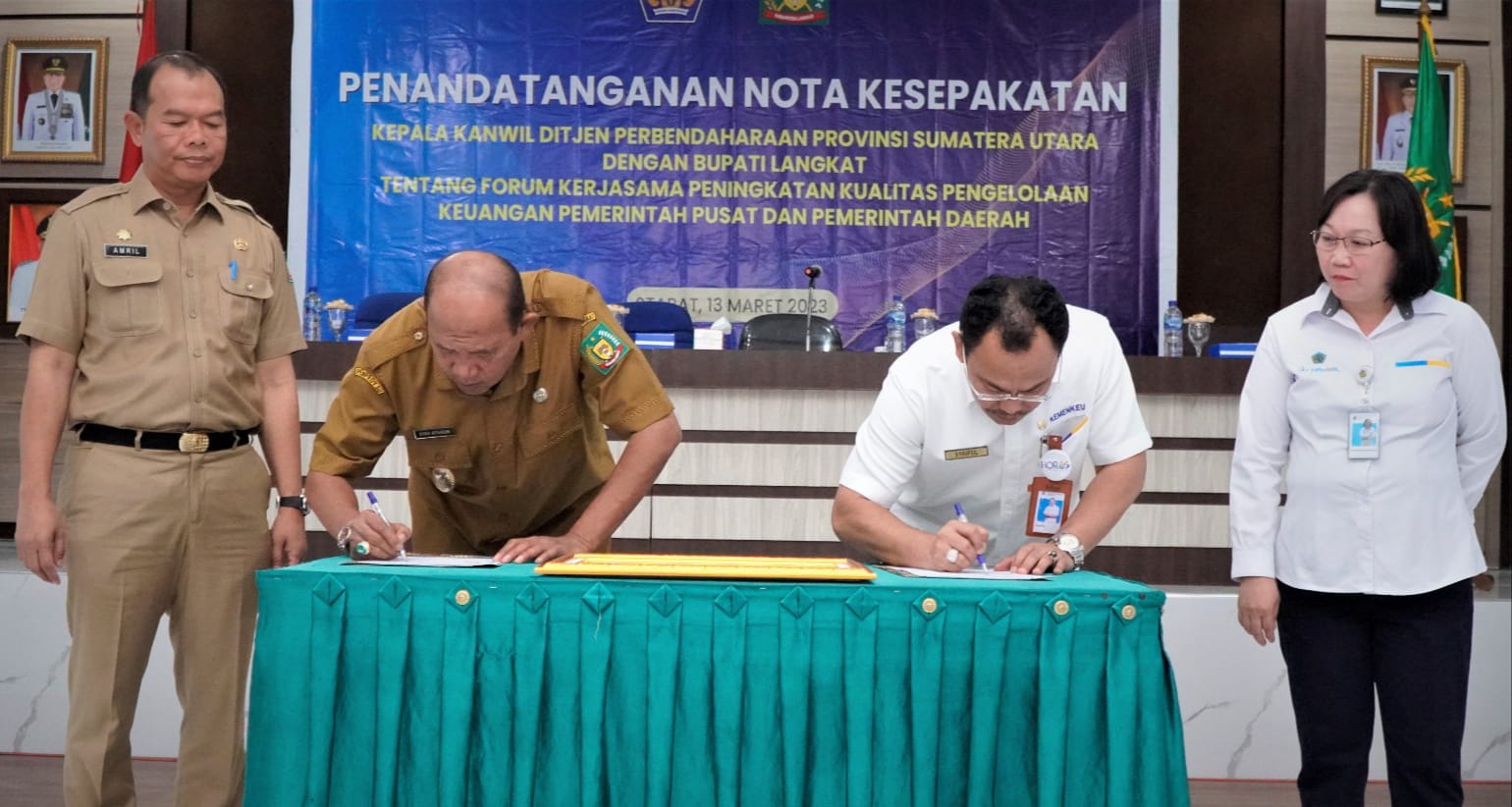 Plt Bupati Langkat H. Syah Afandin, SH menghadiri Penandatanganan Nota Kesepakatan Kepala Kanwil Ditjen Perbendaharaan Provinsi Sumatera Utara, Saiful, SE, AK, MM tentang forum kerja sama peningkatan kualitas pengelolaan keuangan pemerintah pusat dan pemerintah daerah, Senin, 13 Maret 2023.