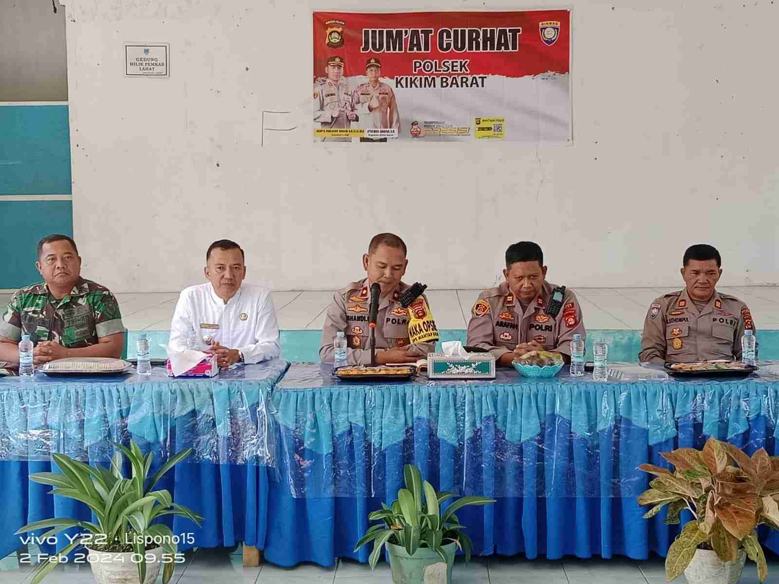 Lensa Mata Lahat – Kapolres Lahat AKBP God Parlasro Sinaga, SH, SIK, MH, yang di wakili oleh Waka Polres Lahat Kompol Ishandi Saputra, SH, SIK, MIK, melaksanakan giat Jum’at Curhat di Aula Kantor Camat Kikim Barat Kab. Lahat, Jum’at (2/1/2024).