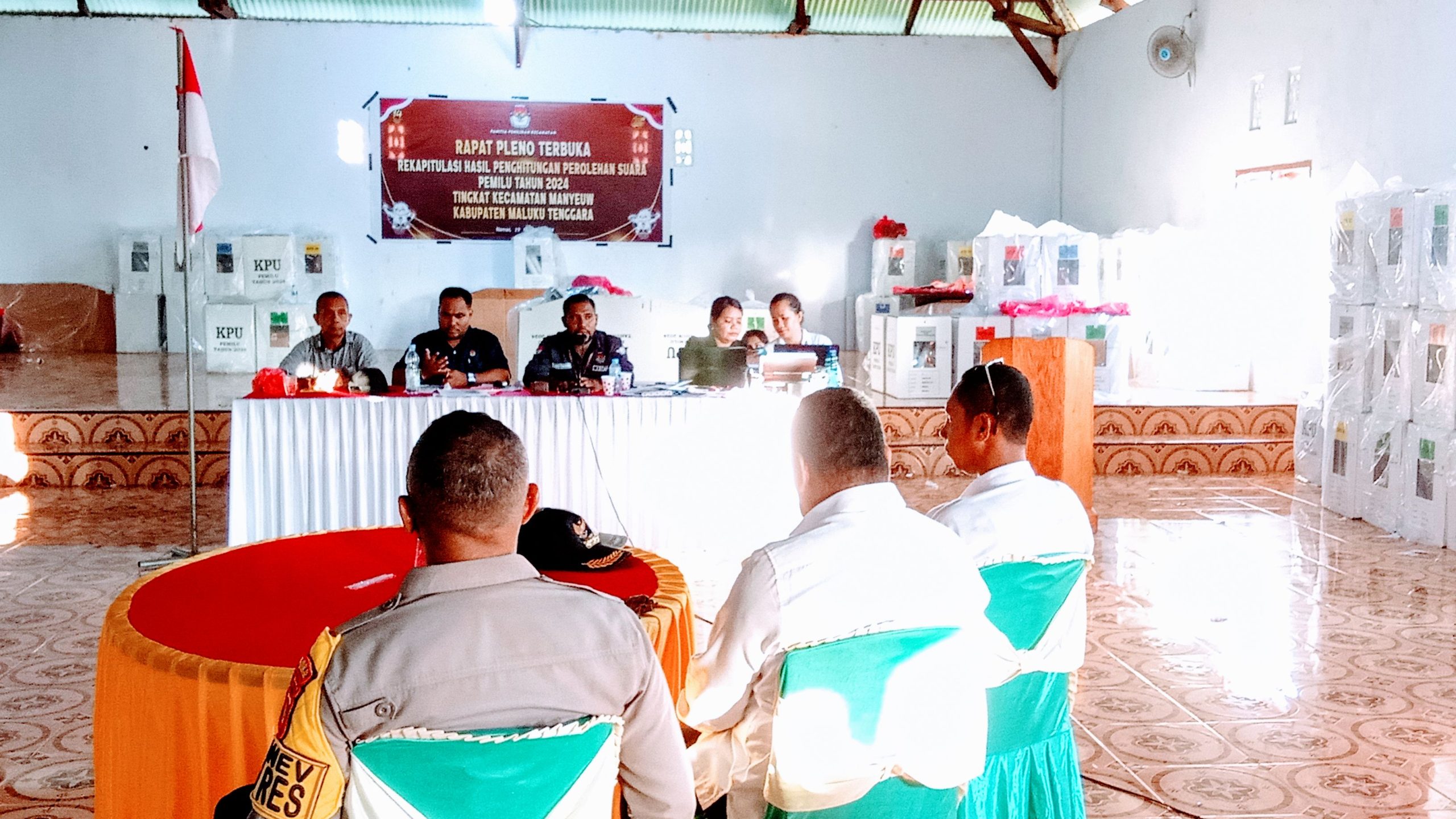 Rapat pleno terbuka tersebut dipimpin langsung Ketua PPK Kecamatan Manyeuw Elias Narko Takerubun bersama sejumlah anggota dan pengurus yakni Bregita Emping, Firdaus Setiti, Triyana Irma Sikteubun dan Titus Tharob serta turut dihadiri Panitia Pemungutan Suara (PPS), Kelompok Penyelenggaraan Pemungutan Suara (KPPS) se-Kecamatan Manyeuw dan para Saksi perwakilan dari masing-masing Partai.