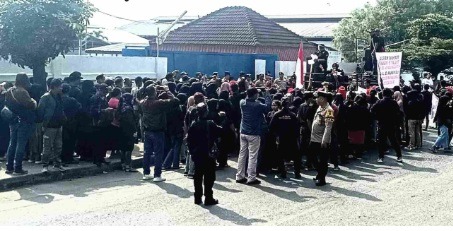Puluhan massa membawa kelengkapan aksi, sound sistem dan spanduk yang mengecam aksi pemecatan tanpa pesangon yang dilakukan manajemen PT MTC&FI pada puluhan karyawati di perusahaan itu.