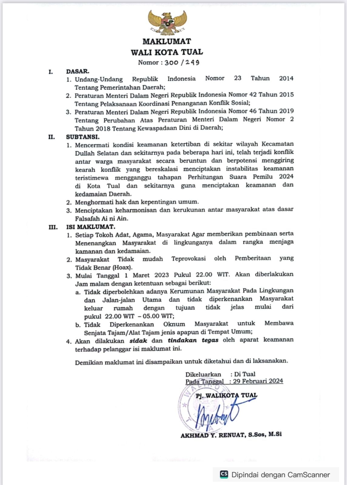 Maklumat tersebut ditetapkan di Tual pada tanggal 29 Februari 2024 dan disahkan oleh Pejabat (Pj) Walikota Tual Hi. Akhmad Yani Renuat, S.Sos, M.Si, M.H