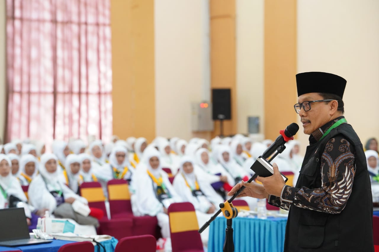 Lensa Mata Medan – Sekretaris Petugas Penyelenggara Ibadah Haji (PPIH ) Embarkasi Medan Tahun 1446 H /2025 M Drs.H. Muhammad Yunus, MA menyambut kedatangan jemaah calon haji Kloter 8 di Aula Jabal Nur Asrama Haji Medan, Jum’at (9/5/2025).