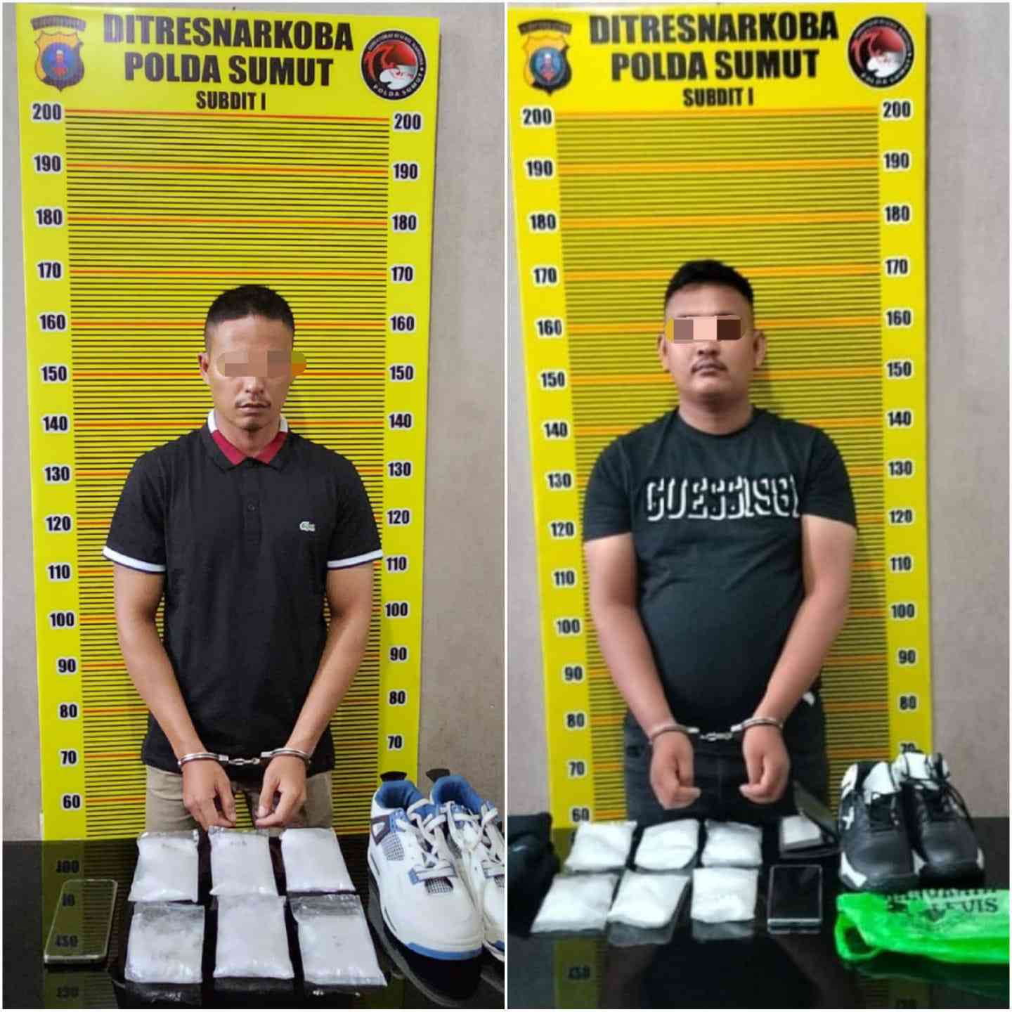 Setelah dilakukan penggeledahan ditemukan 3 bungkus plastik berisi sabu di dalam sepatu sebelah kanan dan 3 bungkus plastik di sepatu sebelah kiri.