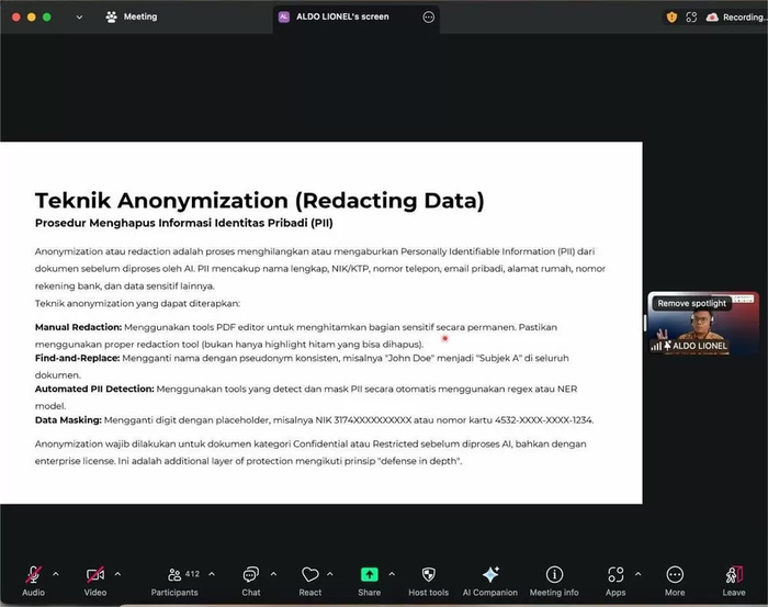 Aldo Lionel Saonard selaku pembicara melakukan diskusi interaktif dengan para peserta melalui sesi tanya jawab mulai dari platform AI yang direkomendasikan untuk manajemen dokumen hingga pentingnya berhati-hati dalam menggunakan data di suatu platform AI. Hal ini memberikan peserta pemahaman bahwa AI dapat membantu pekerjaan sehari-hari menjadi lebih efektif dan efisien. Sesi webinar diakhiri oleh pemaparan dari Farida Dian mengenai program Telkom AI Connect untuk pengembangan talenta digital di Indonesia melalui dukungan wadah Talent Marketplace yang diinisiasi oleh Telkom AI Connect untuk para peserta webinar.