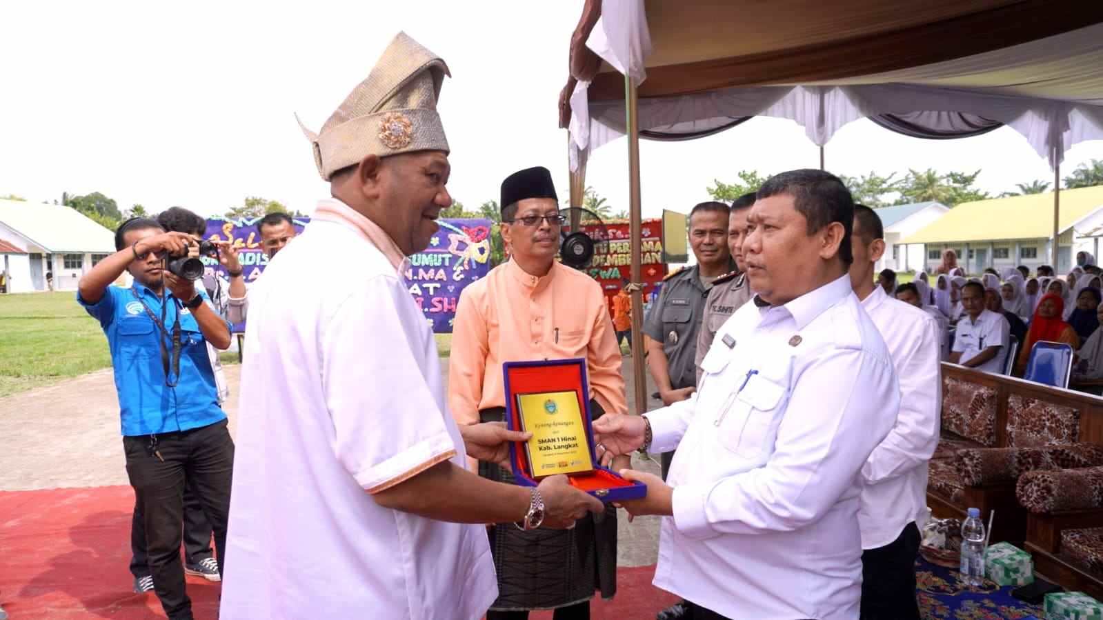 Selanjutnya SMAN 1 Hinai memberikan simbol adat Melayu berupa Tanjak kepada Plt. Bupati Langkat H. Syah Afandin, SH.