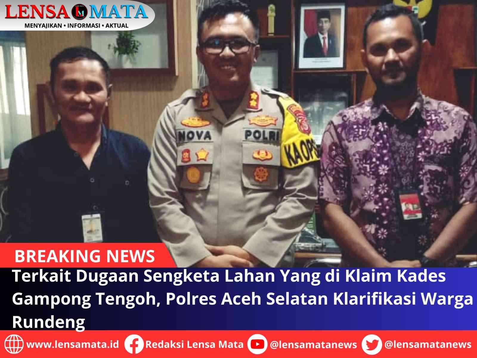 Terkait permasalahan sengketa lahan yang terjadi antara desa diperbatasan Kota Subulussalam dan Aceh Selatan, AKBP Nova Suryandaru, S.I.K., yang dijumpai Lensa Mata diruang kerjanya menghimbau kepada masyarakat agar tertib administrasi dalam hal agraria, seperti nawacita Presiden RI tentang reformasi agraria, setiap warga harus segera mensertifikatkan lahan mereka agar jelas status hukumnya, hingga tidak menimbulkan konflik atau sengketa ditengah masyarakat, jelas nya.