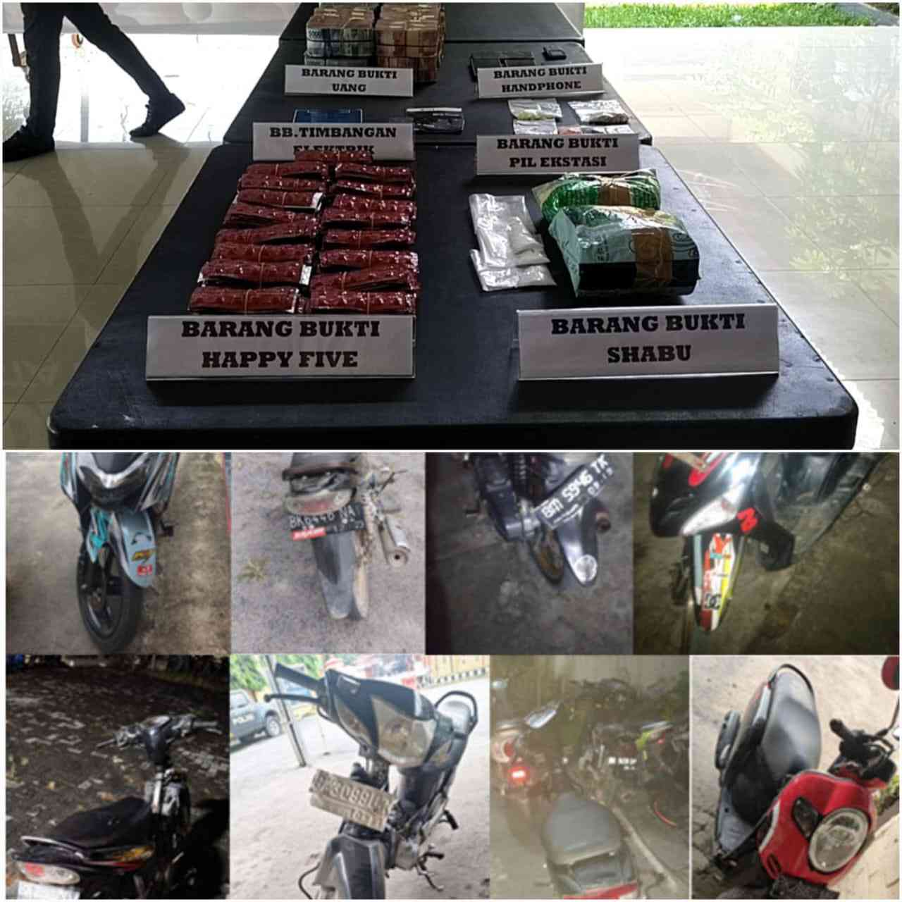 “Untuk jumlah barang bukti yang berhasil diamankan berupa Narkoba jenis SHABU 2058,62 Gram, Pil Ekstacy 220 Butir , Happy Five = 4250 Butir, dan Sp. Motor 8 Unit, Uang Rp 1.015.108.000, HP 6 Unit , Timbangan Digital 2 Unit serta Bong 3 buah” ucapnyalagi.