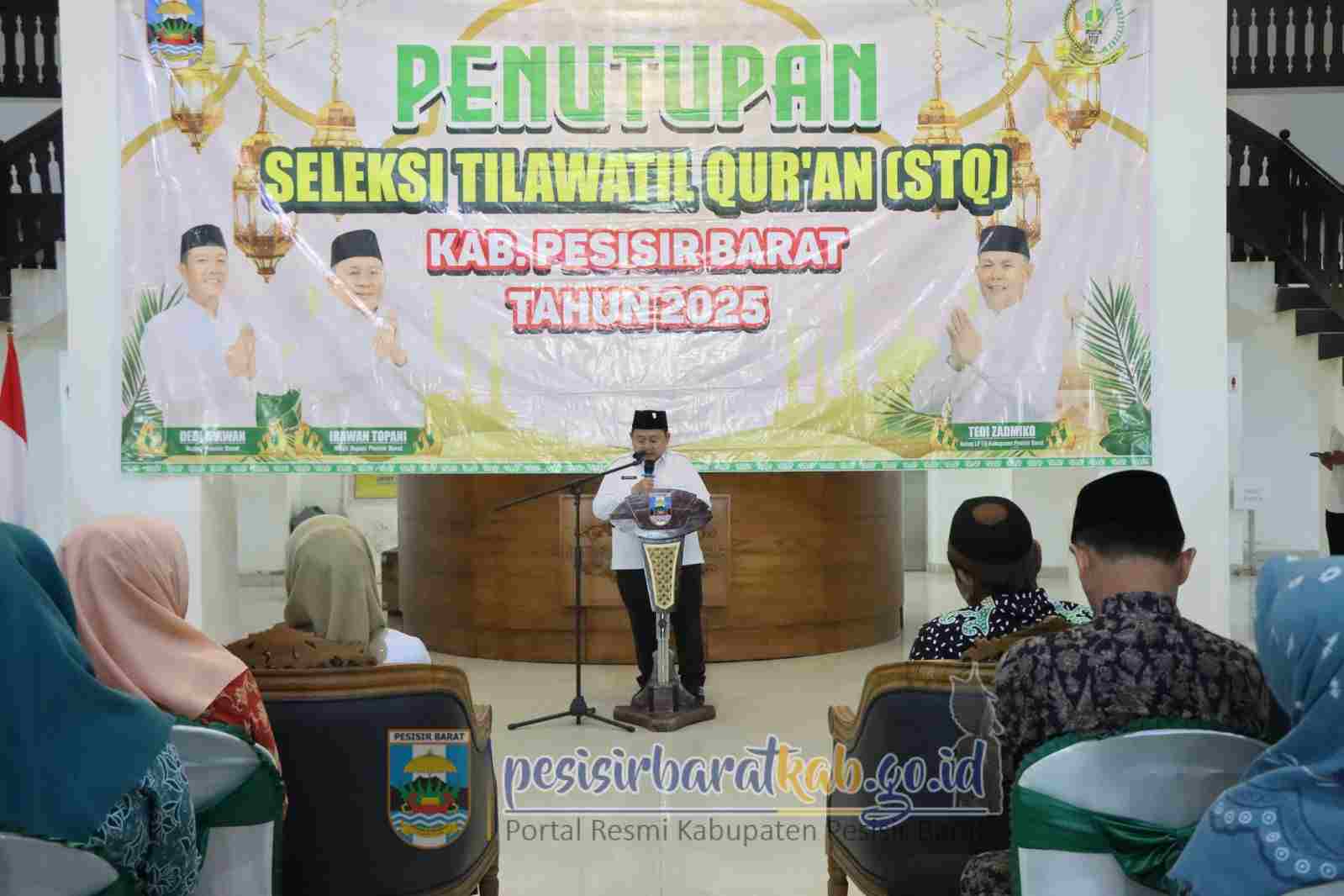 Lensa Mata Pesisir Barat – Wakil Bupati Pesisir Barat (Pesibar), Irawan Topani, S.H., M.Kn., resmi menutup pelaksanaan Seleksi Tilawatil Quran (STQ) Tahun 2025, Lobby Teluk Stabas Lantai 1 Gedung Marga Sai Batin Komplek Perkantoran Pemkab Pesibar, Rabu (5/10/2025).