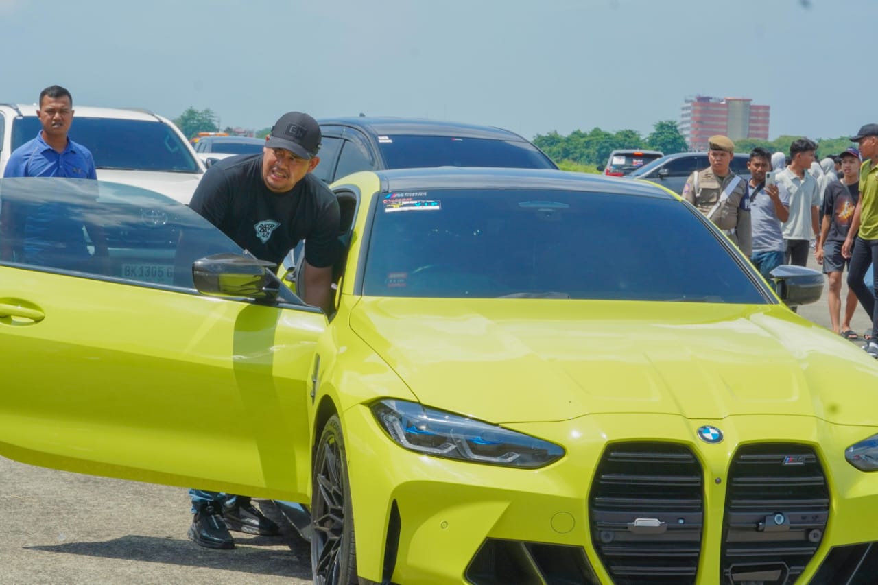 Lensa Mata Medan – Suara riuh dan tepuk tangan dari ratusan penonton mengiringi laju mobil Mercedez Benz bermesin V8 dikemudikan Wali Kota Medan Bobby Nasution saat menjajal lajur lintasan Racers Day Out (RDO) Kolaborasi Medan Berkah Drag Race Cars & Bike di Eks Bandara Polonia Medan, Minggu (14/7). Dalam balapan lintasan lurus tersebut, orang nomor satu di Pemko Medan ini unjuk kebolehan dalam memacu kecepatan dengan drifter lain yang tampil mengemudi mobil BMW.