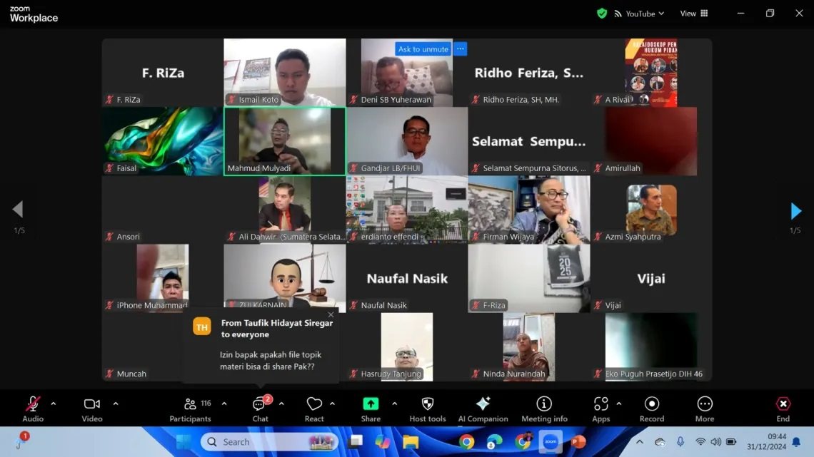 Kegiatan ini berlangsung pada Selasa, 31 Desember 2024, pukul 08.30 WIB, melalui platform Zoom.Acara ini dihadiri oleh sejumlah tokoh terkemuka di bidang hukum pidana.