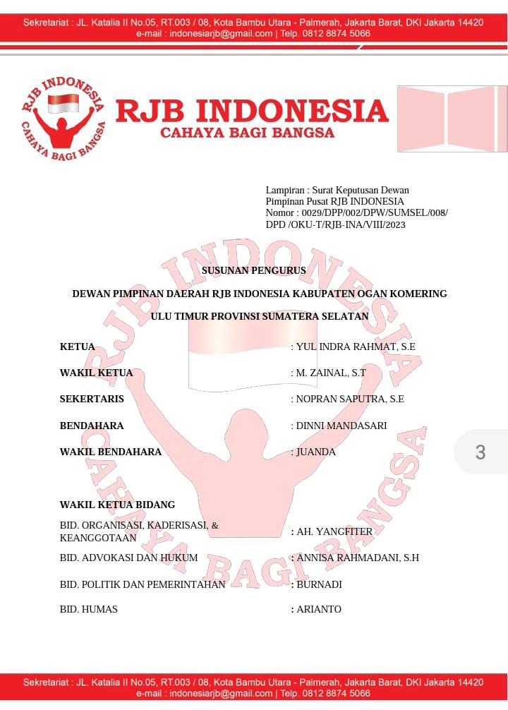 Sesuai dengan surat keputusan tertuang dengan nomor SK.029/DPP/DPW/SumSel/06/DPD/OKU -T/RJB/INA/IX/2023 tertanggal,15 September 2023 yang di tandatangani oleh ketum DPP RJB Indonesia ibu Silvia D Soembarto, SH.